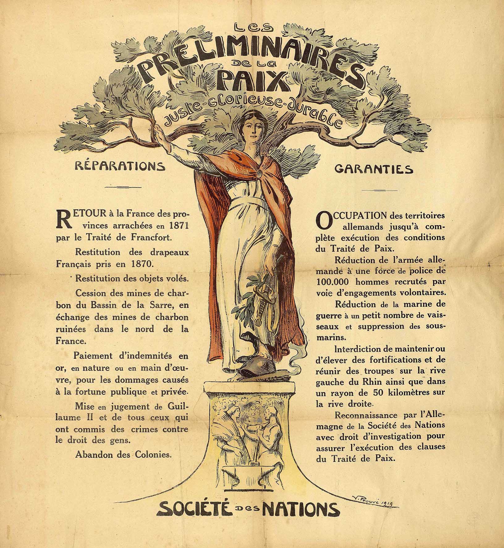 Les préliminaires de la Paix, Juste, Glorieuse, Durable, affiche imprimée, 75,5 x 70 cm, 1919. Victor Prouvé.