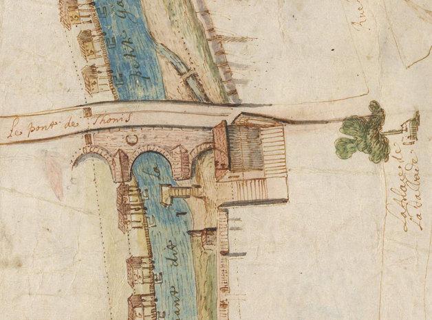 Le pont de Tounis. Plan de l'île de Tounis et des terriers donnant sur la Petite Garonne, dressé à l'occasion du procès entre les religieuses Sainte-Claire du Salin et le premier président Le Mazuyer (1650). Attribué à Hilaire Pader, détail. Ville de Toulouse, Archives municipales, 61Fi1.Ce pont, aujourd'hui le plus vieux de Toulouse, est peu visible. La Garonnette, asséchée à la fin des années 1950, a été transformée en voie de circulation. Quant au pont, il n'offre plus aux yeux des Toulousains qu'une fraction de son élévation. En effet, il semble que l'ouvrage, à partir de la seconde pile, ait été rapidement enserré par les constructions de l'île de Tounis avant de disparaître, complètement absorbé par les aménagements urbains du 19e siècle. La pose d'un enduit imitant la pierre de taille et la reconstruction partielle de l'éperon dissimule son aspect d'origine et affecte sa valeur historique.
