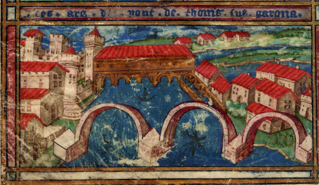 La construction du pont de Tounis. Annales manuscrites de la ville de Toulouse, 1516-1517, chronique sans n°, ([gauche/droite/verso], détail. Ville de Toulouse, Archives municipales, BB273.L'ouvrage en construction est représenté à la demande des capitouls dans les annales de la ville de 1516. Le pont de brique se compose de trois arches reposant sur deux piles dont les éperons permettent de rompre le cours de l'eau. Édifié en pente, il rattrape un dénivelé de plus de 5 mètres entre la rive et l'île. Remis en état régulièrement, il traverse les siècles et offre aux habitants de l'île de Tounis la possibilité de circuler plus sûrement entre les deux rives.