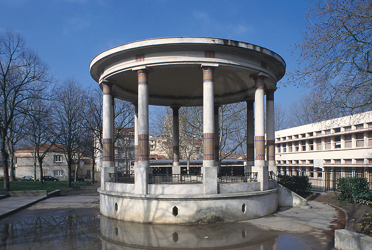 Les plans de l’ouvrage sont dressés par l’architecte Guillaume Dargassies en 1885. Il propose une fontaine d’agrément à trois bassins superposés - deux en fontes s’écoulant dans la cuve principale en pierre - et dont la nymphe des eaux, au sommet, était couronnée par un globe électrique permettant l’éclairage de la fontaine (installation démontée depuis).  De nombreuses figures décoratives complètent cet assemblage : des putti poissons soufflant dans une corne ainsi que des angelots dont certains arborent des ailes de libellules.