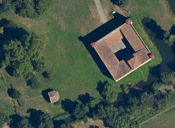 La vue aérienne montre des traces au sol qui correspondent aux contours des anciens murs disparus.