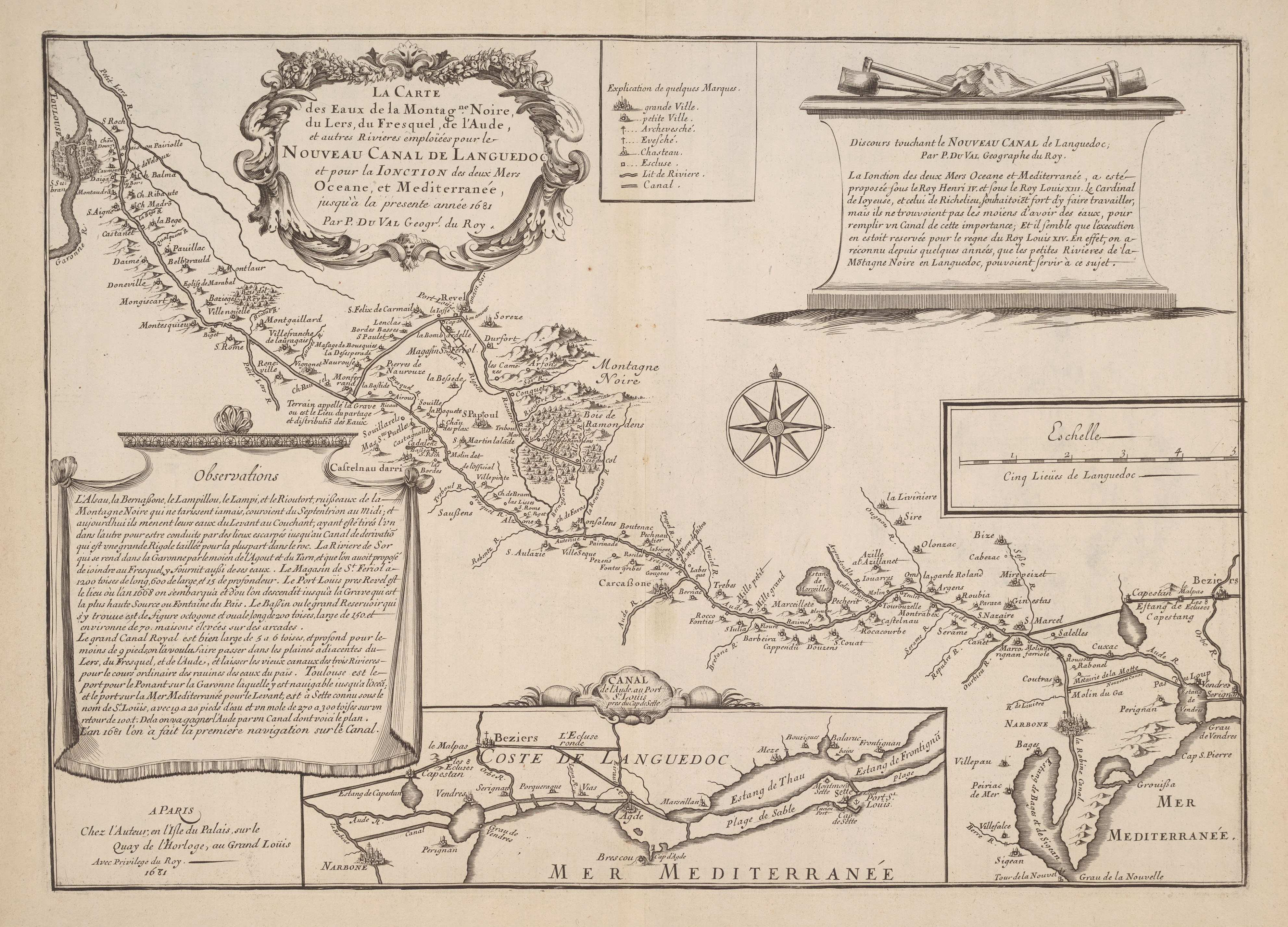 [Canal du Midi], Carte du Canal du Midi entre Toulouse et Sète mettant en lumière l'alimentation en eau du Canal. 1681. Titre : "La Carte des Eaux de la Montagne Noire, du Lers, du Fresquel, de l'Aude et autres Rivières emploïées pour le Nouveau Canal de Languedoc et pour la Jonction des deux Mers Océane et Méditerranée, jusqu'à la présente année 1681 par P. Du Val, géographe du Roy. En Bas, à gauche : "à Paris, chez l'auteur en l'Isle du Palais, sur la Quay de l'Horloge, au Grand Louis. Avec Privilège du Roy. 1681. "DU VAL, P. (géographe du Roy), DU VAL, P., Paris, 1681, 44 x 56. Ville de Toulouse, Archives municipales, 20 Fi 167.