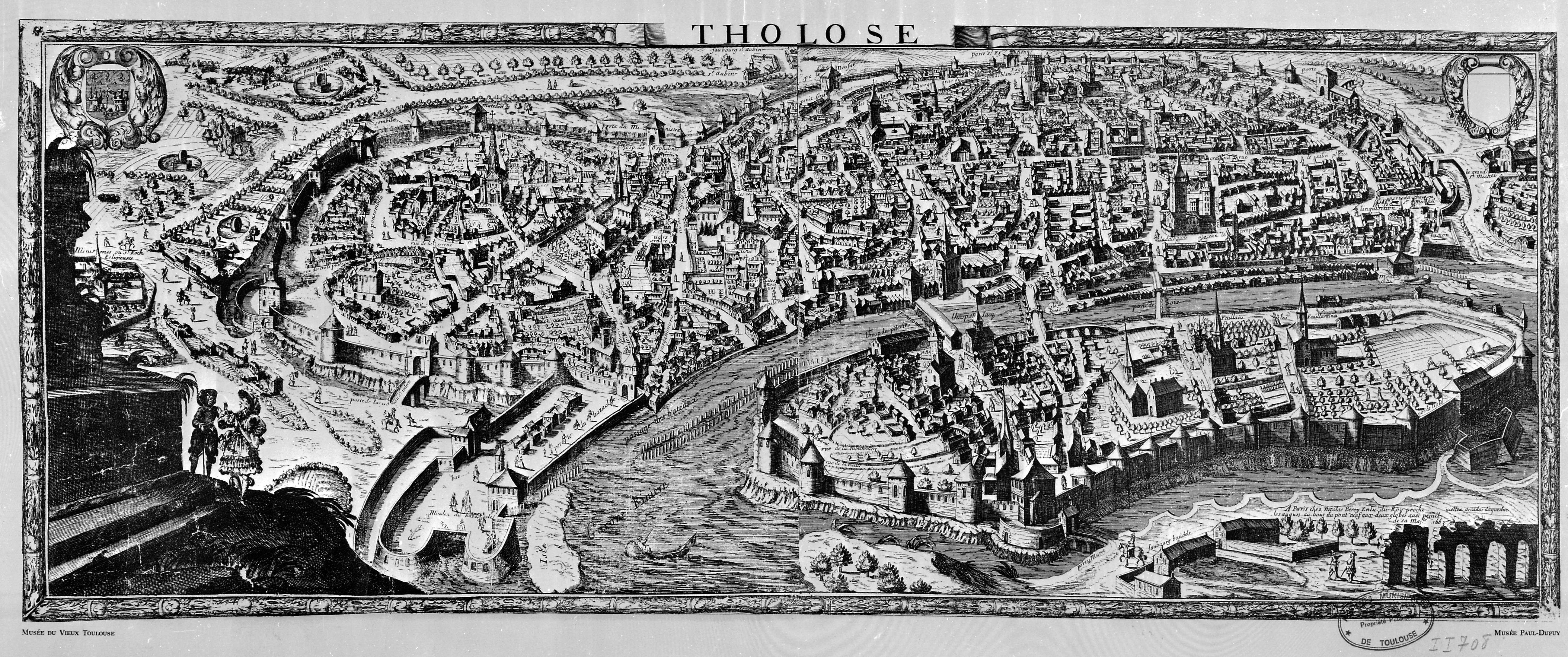 Ces deux gravures quasi-identiques posent des problèmes de datation et d'auteur. C'est une vue cavalière de la ville de Toulouse.