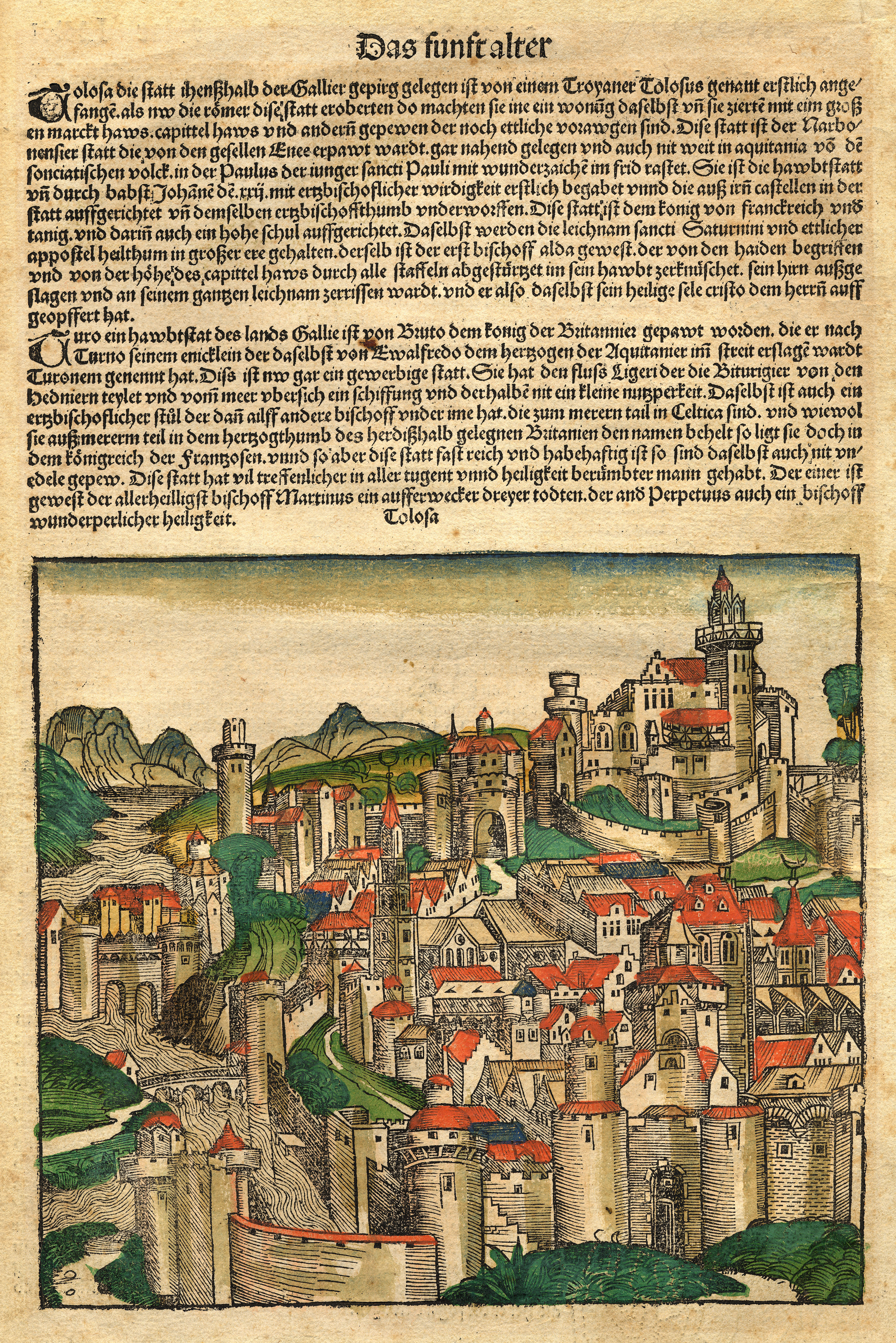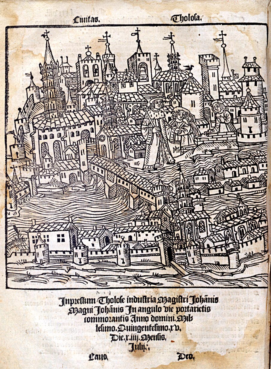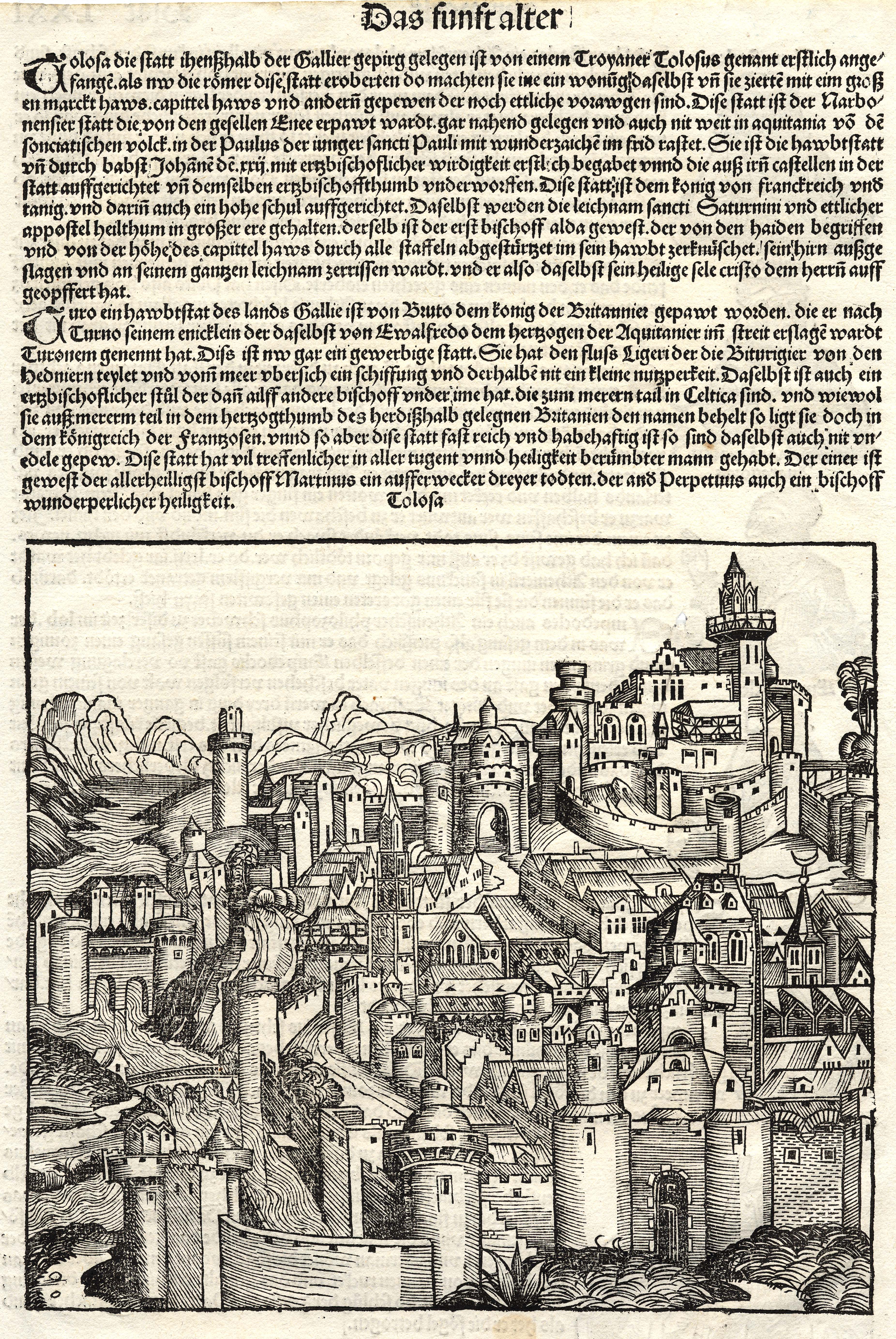 Ces deux versions d'une même gravure sur bois représentent, comme l'indique le titre « Tolosa », la ville de Toulouse. Elles sont extraites de la Chronique de Nuremberg écrite par Georges Braun en 1493. Ce livre allemand est composé de descriptions des grandes villes d'Europe.