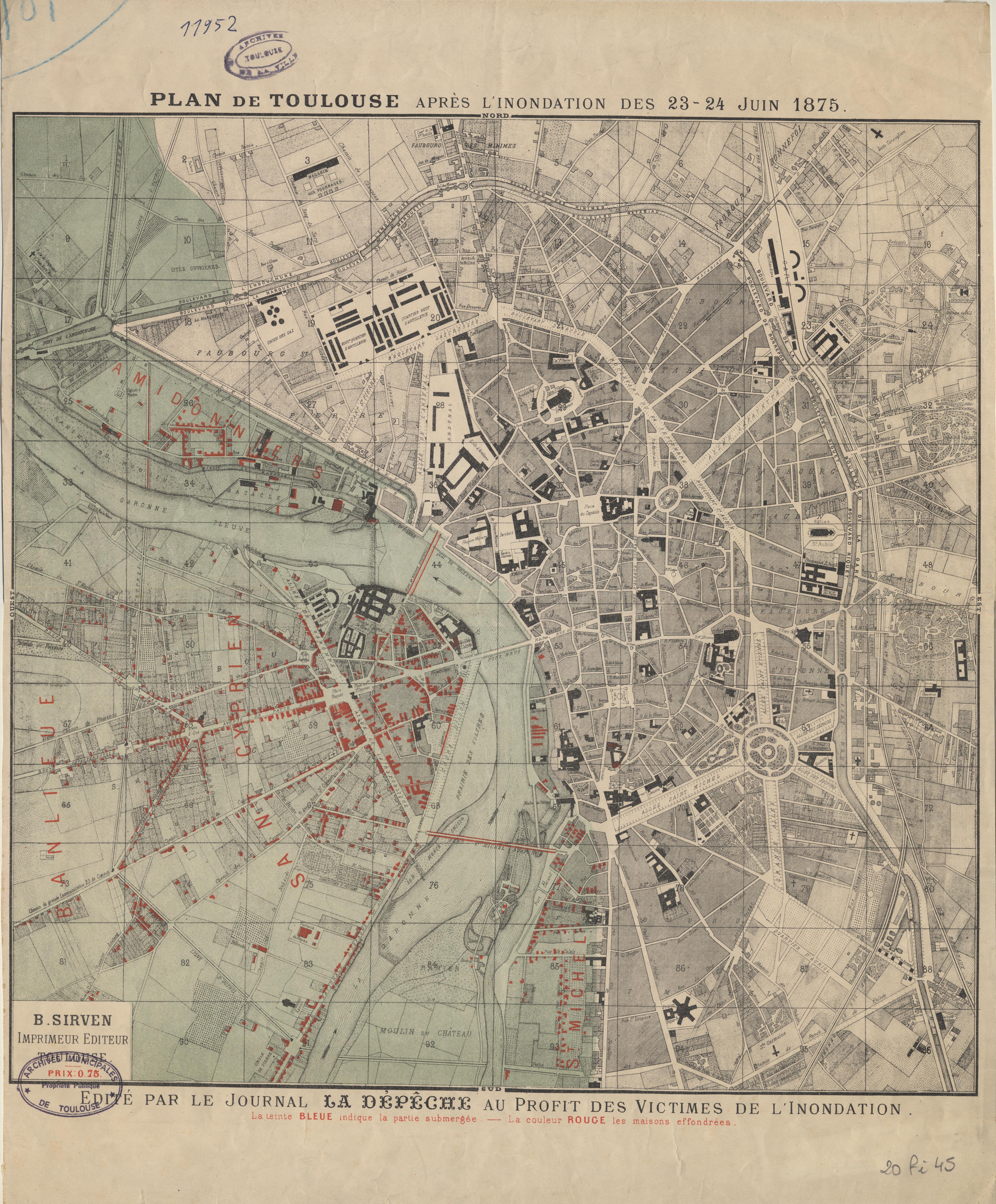 La couleur bleue indique la partie de la ville submergée par la crue de la Garonne. En rouge, sont représentés tous les bâtiments ayant subi des dégâts. Le quartier Saint-Cyprien est très touché. Le pont Saint-Pierre et le pont Saint-Michel n'ont pas résisté à la force des eaux.