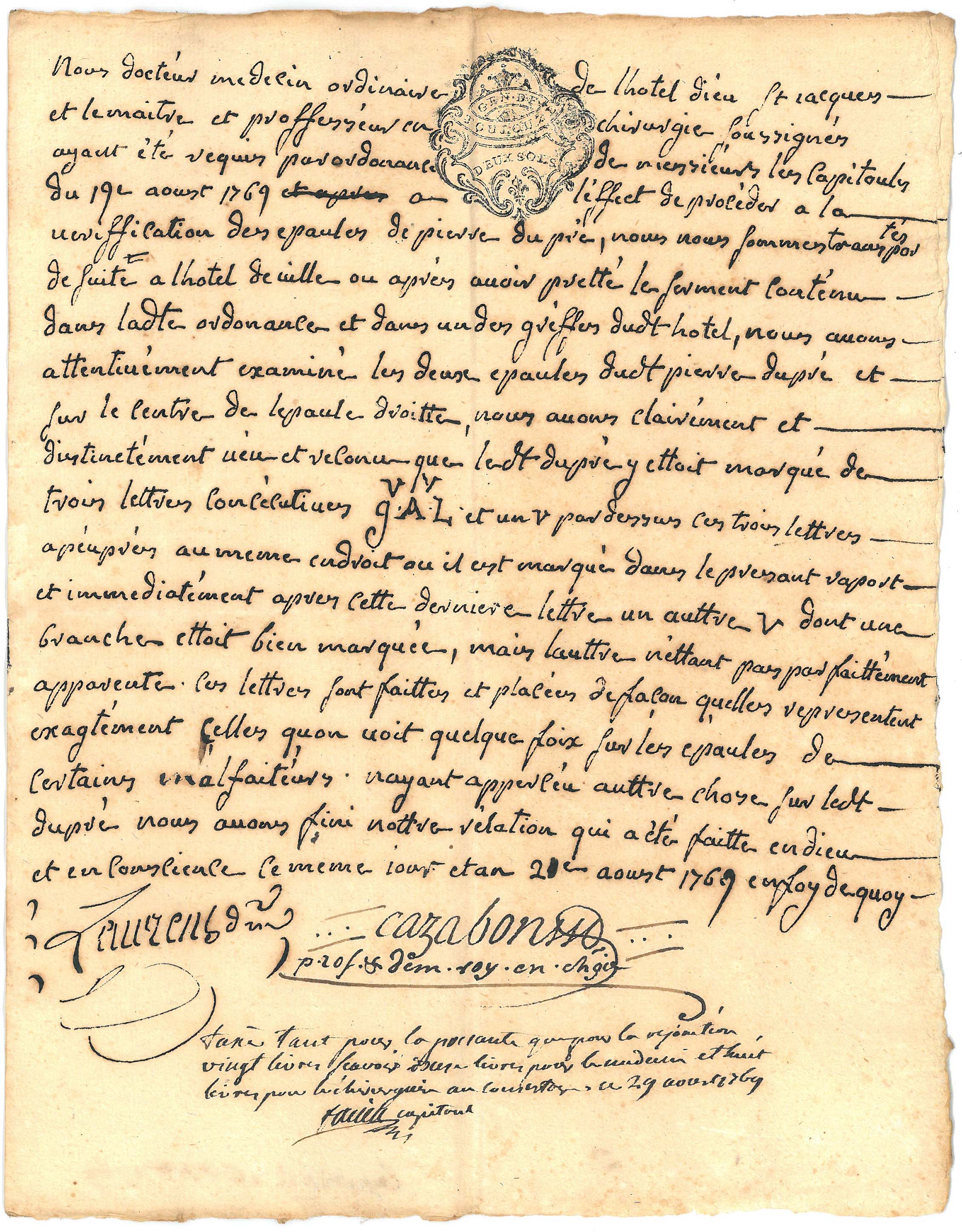 Mais alors que signifie ce GAL ? Serait-ce Gallinacé, Galimafrée, Galaxie, Galopin, Galant, Galette ou encore Gallois ? Non, il s'agit tout simplement de GALères. Le diminutif ou l’abréviation en question est créé pour être porté sur la peau, à même la peau, par ceux condamnés à la peine des galères. Il n'est pas décalqué, ni tatoué, mais appliqué avec un fer rouge ardent sur l'épaule droite du condamné. Voici là un casier judiciaire indélébile – enfin, en principe – dont on reste décoré à vie. Celui de Pierre Dupré, qui illustre ce billet, est à ce titre assez éloquent, ses épaules étant couvertes de marques diverses appliquées par un certain nombre de bourreaux du royaume.