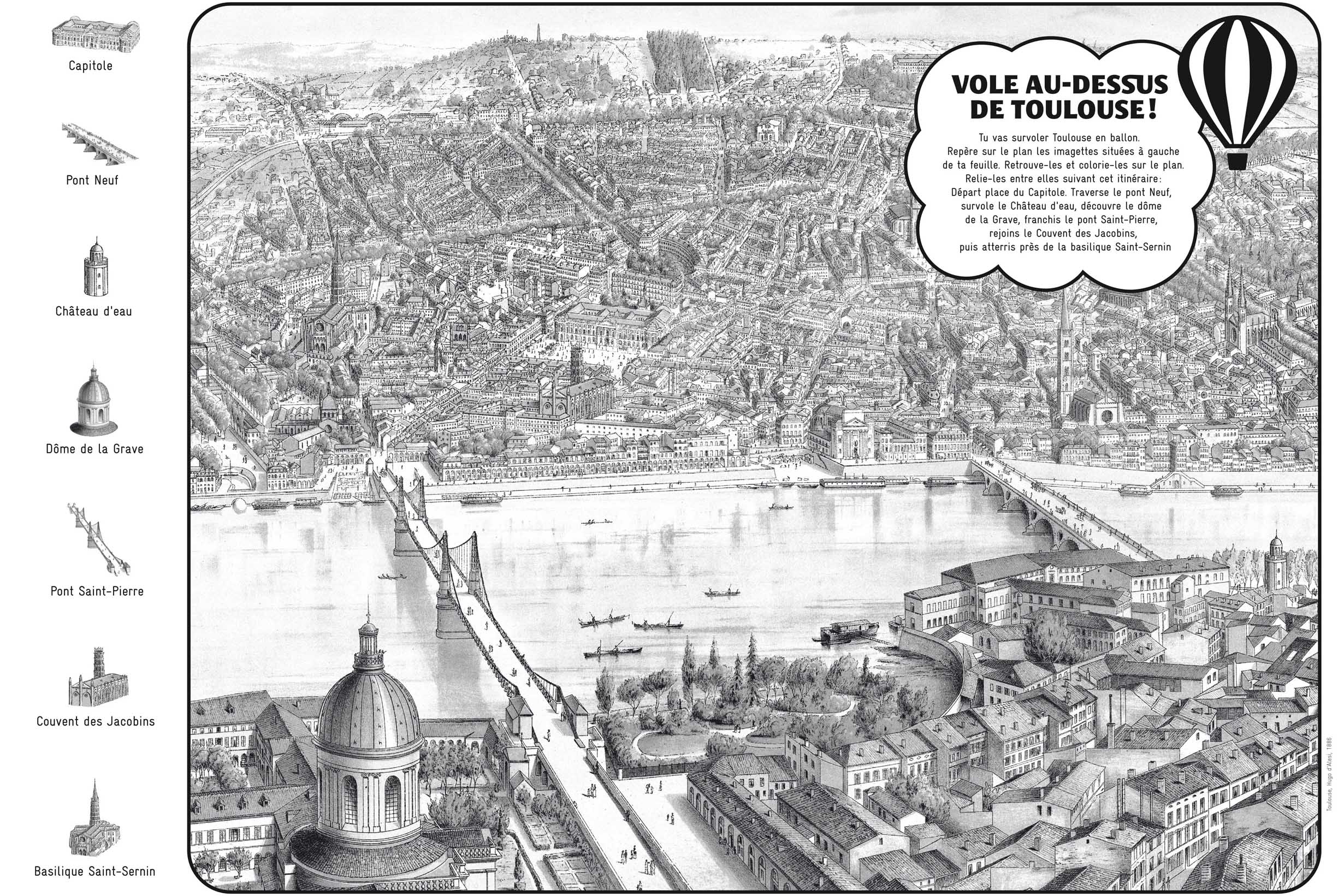 n petit cadeau pour vous : Vole au-dessus de Toulouse, un plan à colorier et pour jouer.