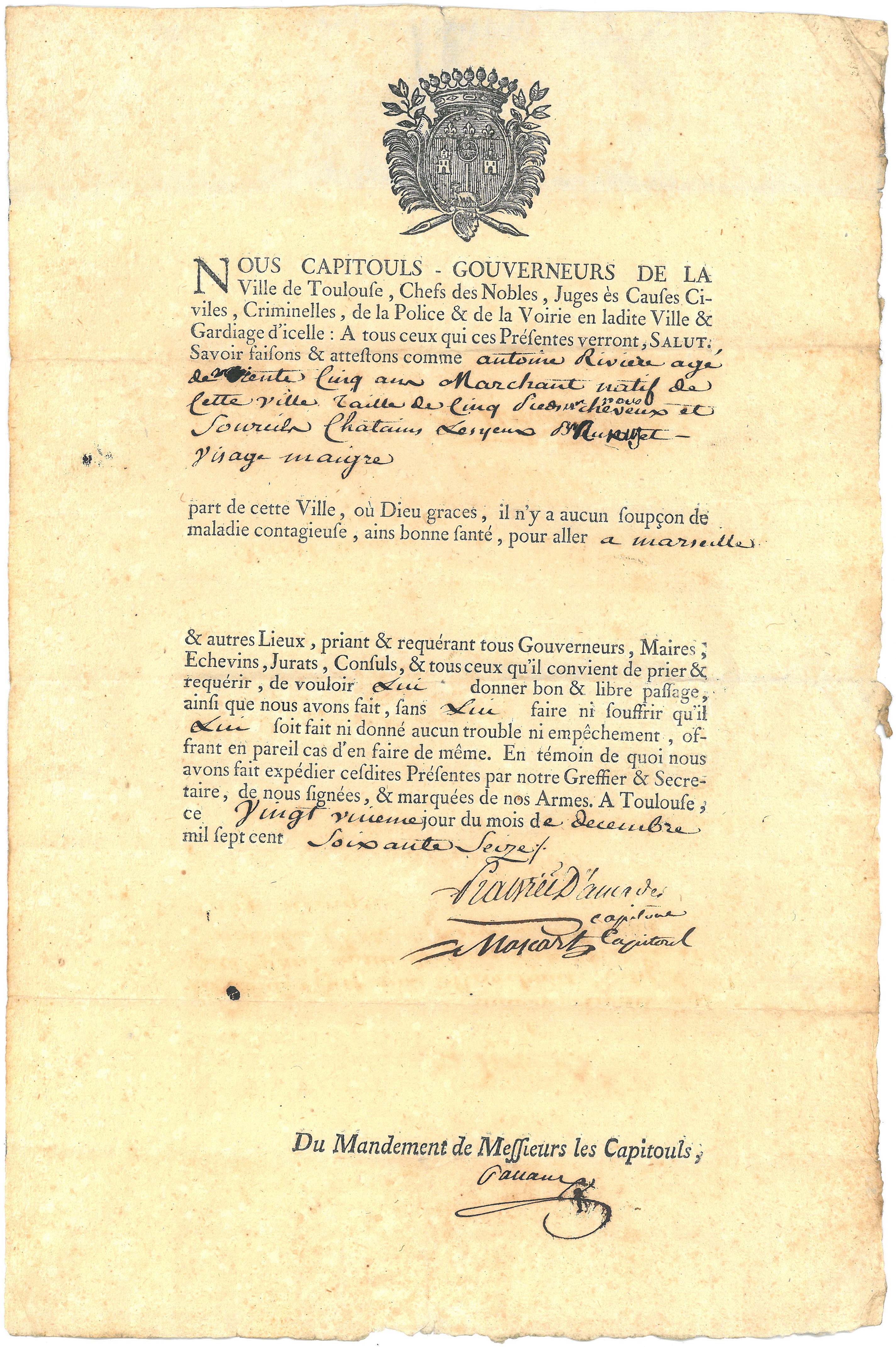 Ce jour-là, après mûre réflexion entre les capitouls, les assesseurs, les médecins et autres prud'hommes, une délibération est prise, et l'on publie cette ordonnance municipale qui interdit aux marchands et taverniers de travailler le vin, d'y mêler de la terre glaise, du sel, du vermillon du Brésil1, de l'alun de roche, du calomel, des crottes de chien, de la chaux et autres matières nuisibles, comme aussi d'importer à Toulouse aucun vin ainsi arrangé2.