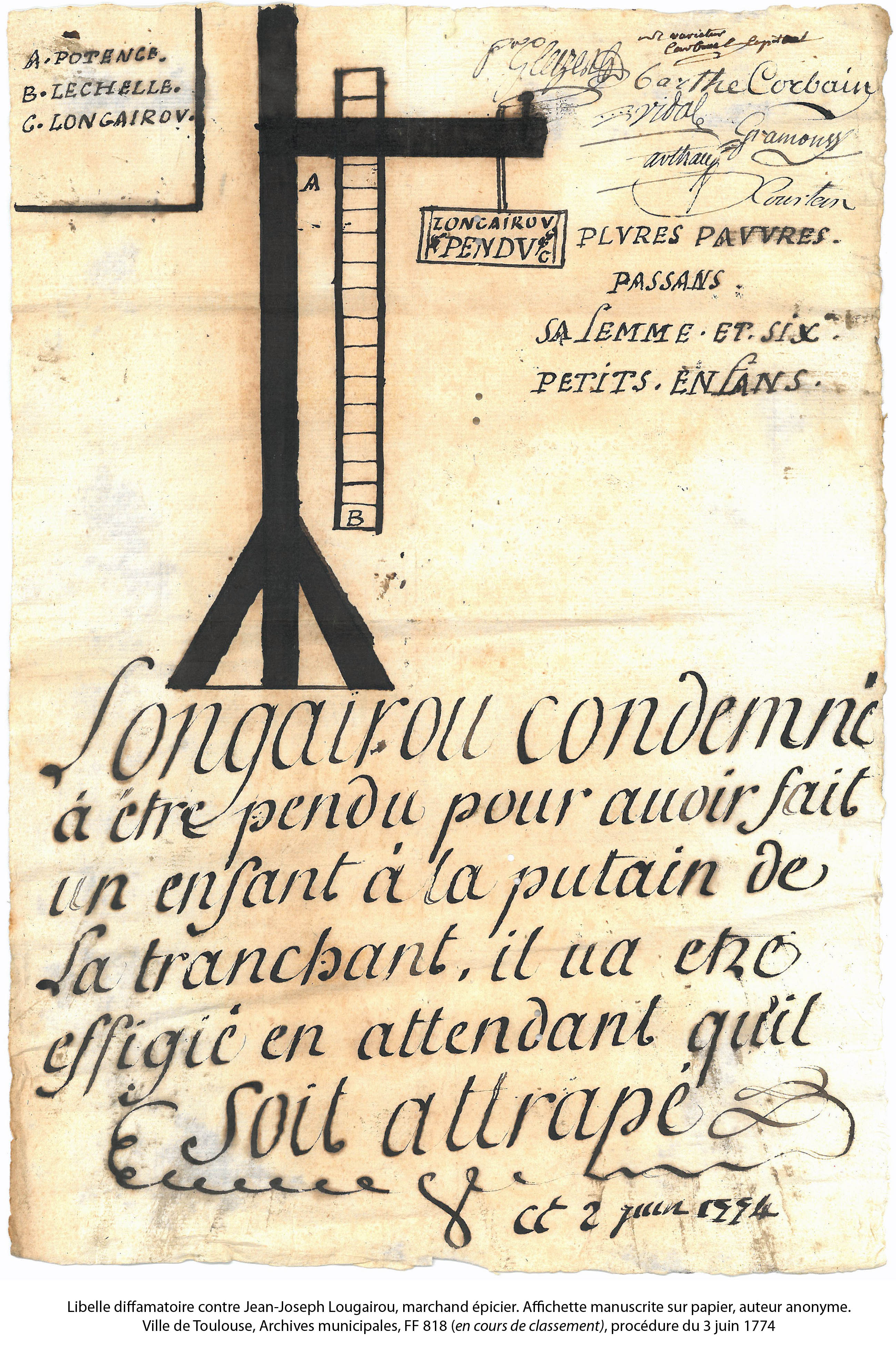 Les archives de la justice criminelle des capitouls nous offrent ainsi un certain nombre de placards diffamatoires, en général manuscrits. Certains ont été produits en grand nombre et affichés dans toute la ville, d'autres en exemplaire unique et placardés devant la porte de la victime.