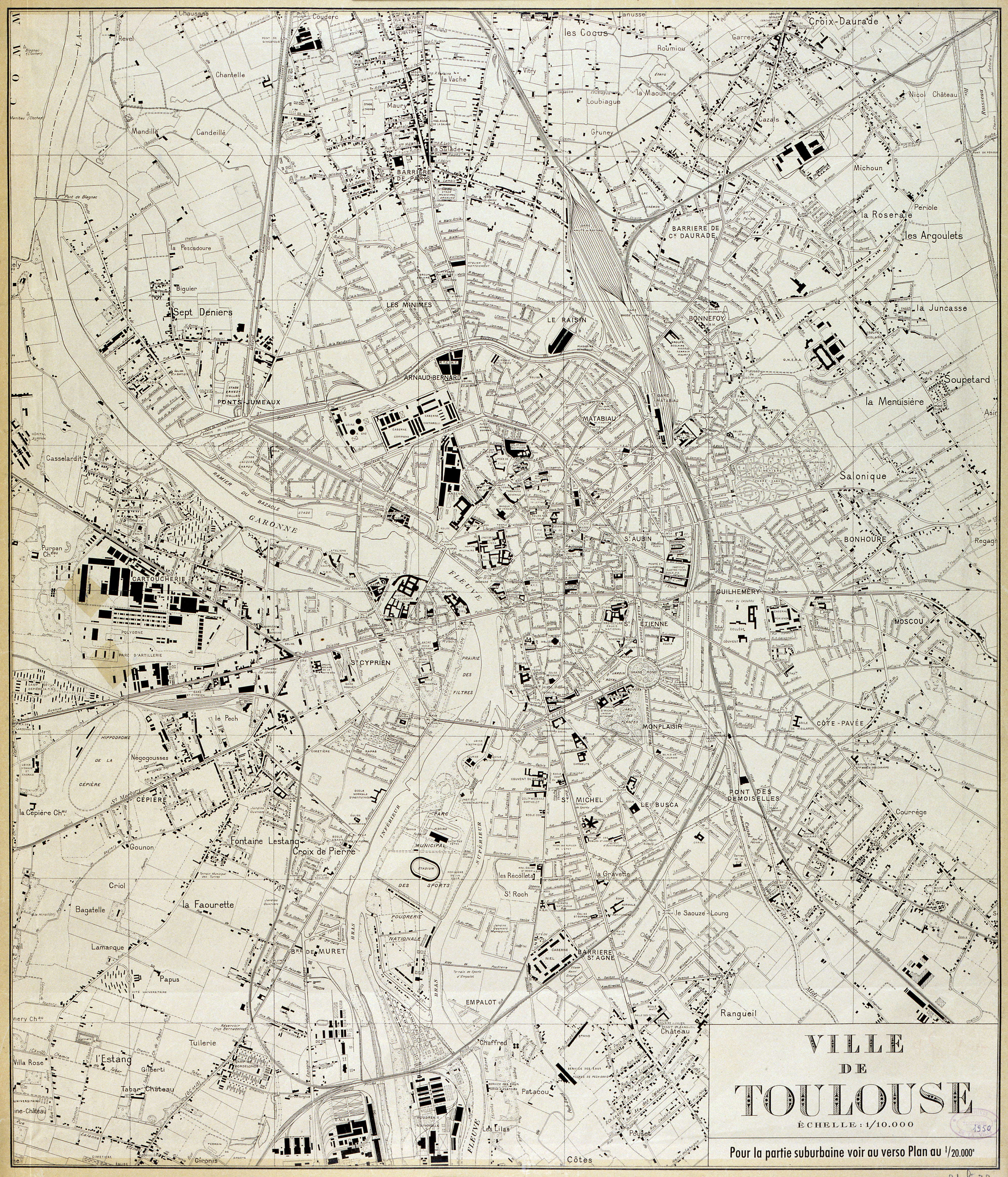 Vue aérienne du cours de la Garonne en aval du pont Saint-Pierre, 22 octobre 1973. Direction de la communication - Ville de Toulouse, Archives municipales, 15Fi2292/1.