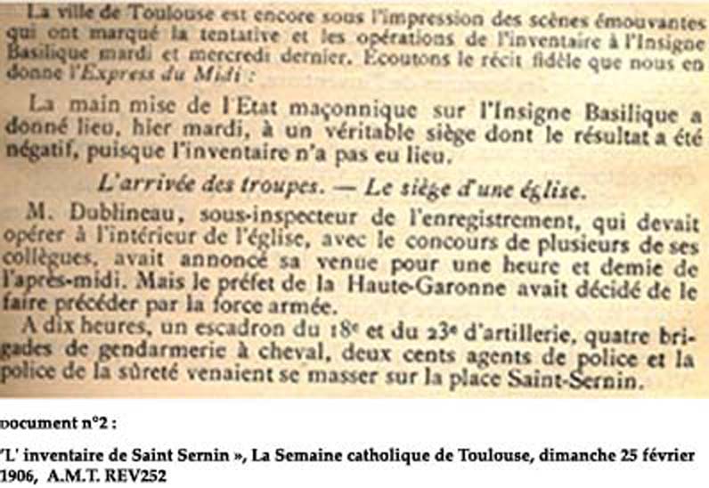 Les deux premiers portent sur les conditions dans lesquelles se passent les inventaires de la basilique Saint-Sernin et de l'église Saint-Sylve. L'inventaire de Saint-Sylve, donne lieu, dans la matinée du 15 février 1906, à des mouvements de résistance, et des incidents. Ces protestations font suite à l'encyclique Vehementer nos du pape Pie X le 11 février 1906, dans laquelle il condamne le principe de la séparation, et encourage les catholiques français à s'opposer aux inventaires des biens ecclésiastiques. Les personnes en présence sont : l'abbé Péfourque et d'autres religieux de l'église Saint-Sylve ; les représentants de l'Etat chargés de l'inventaire : le commissaire central des Domaines, M. Lieux et ses sous-inspecteurs, dont M. Bonnay, et les forces de l'Ordre ; ainsi que des catholiques, dont Mme Jacquette Bénabent. Quant à celui de Saint-Sernin, il entraîne quelques jours plus tard une mobilisation importante de forces de l'ordre.